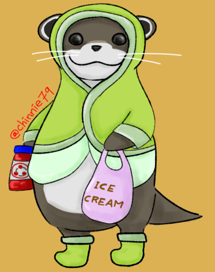 Quick doodle of Odder Otter in winter coat, from silly conversation about hot summer, otter, ice cream for dinner, and whether maraschino cherry is yay or nay.