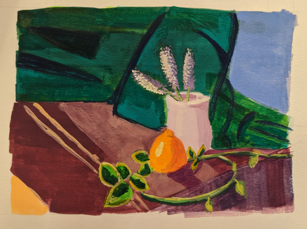 Second try of first week exercise. I did better mixing color, but failed painting flat colors, due to too much water, and not waiting to paint to dry before applying more coat.