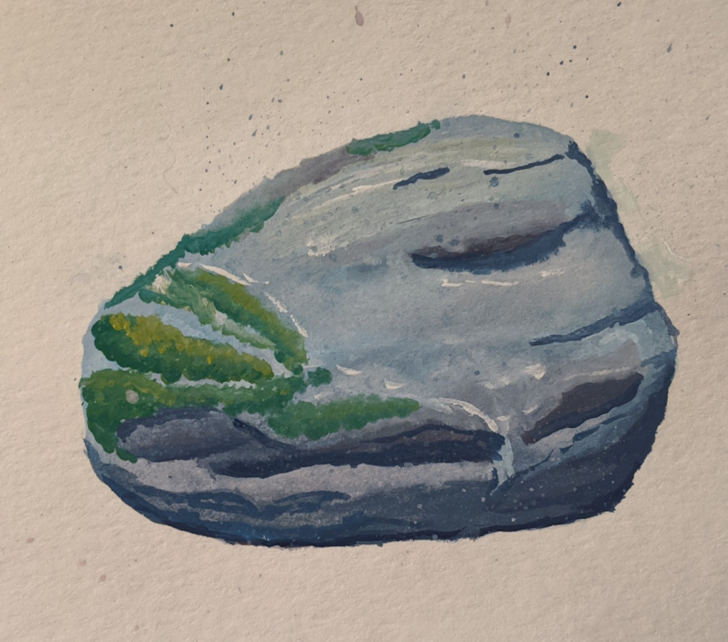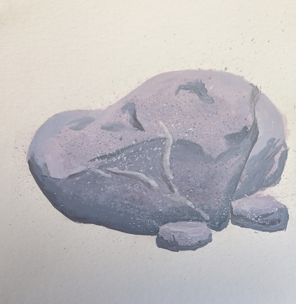 Grumpy rock! I had fun painting this, but forgot to block part of the paper when flicking wet paints. The rock ended up looking like a grumpy Snoopy.